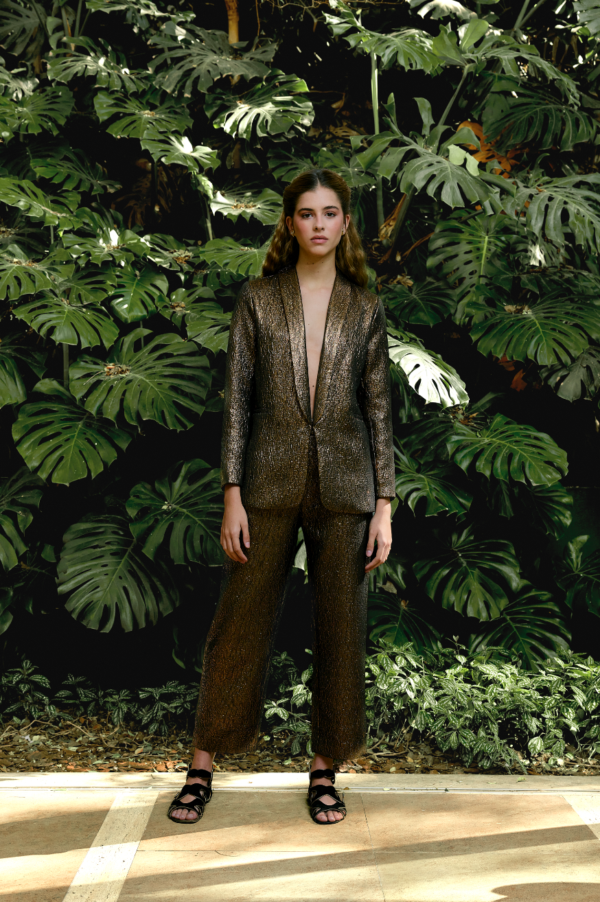 A Calça Malu é feita de um jacquard dourado metalizado com textura. Ela tem um corte de alfaiataria, com modelagem reta e comprimento abaixo do tornozelo. A calça possui bolsos laterais e passante de cinto no cós. Use com o Blazer Malu para um look festivo e moderno.