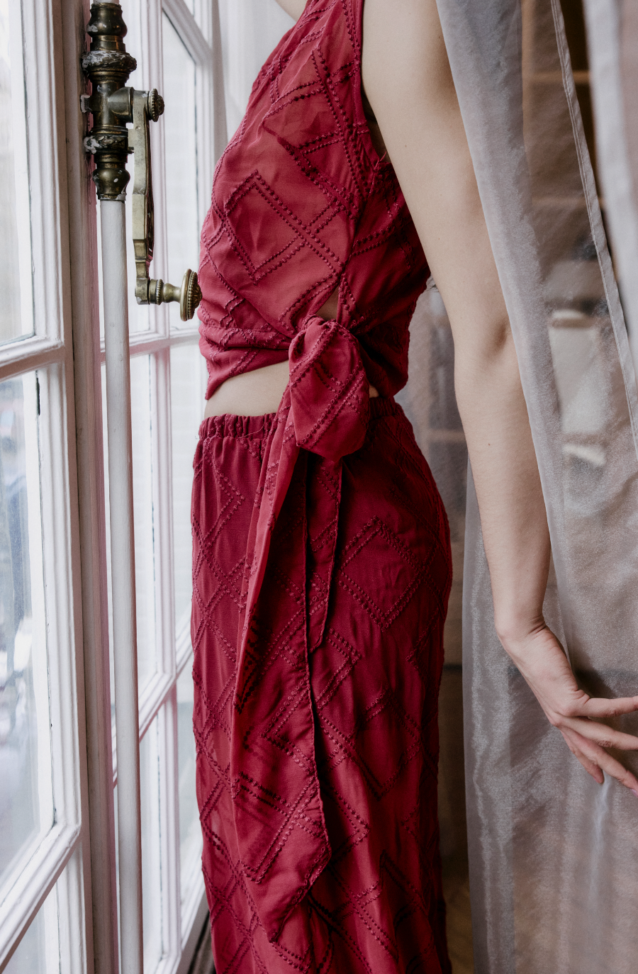 A Blusa Ale é uma blusa leve, feita de chiffon com bordados no mesmo tom. Ela tem uma leve transparência que permite uma brincadeira com o top usado por baixo. A blusa tem uma faixa na cintura que pode ser amarrada de vários jeitos, permitindo que a altura dela seja ajustada.