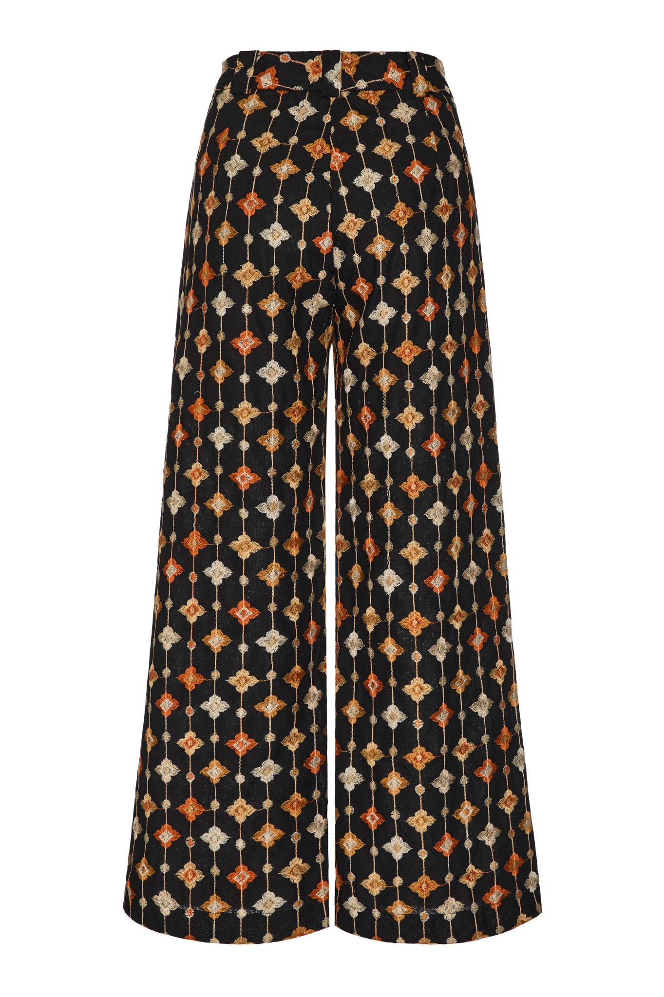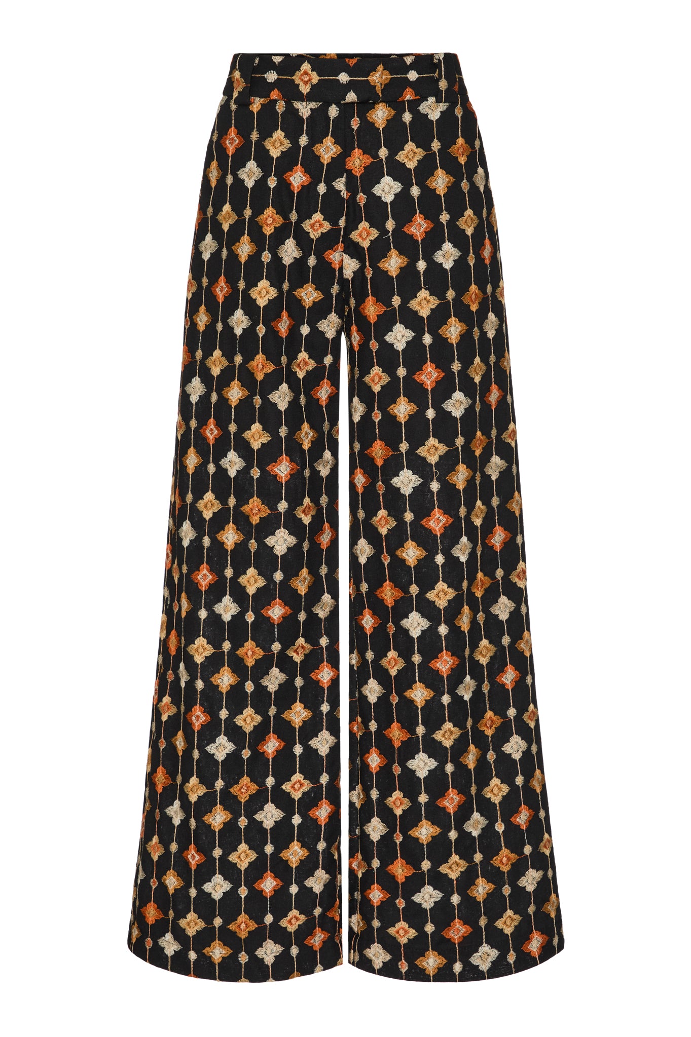 A Calça Ayla é feita de um tecido de linho com bordado floral. Ela é uma calça super estilosa de alfaiataria com corte wide-leg, e possui bolsos laterais e passante de cinto no cós. Use com o Colete Ayla para um look completo de arrasar, ou também brinque com combinações diferentes!