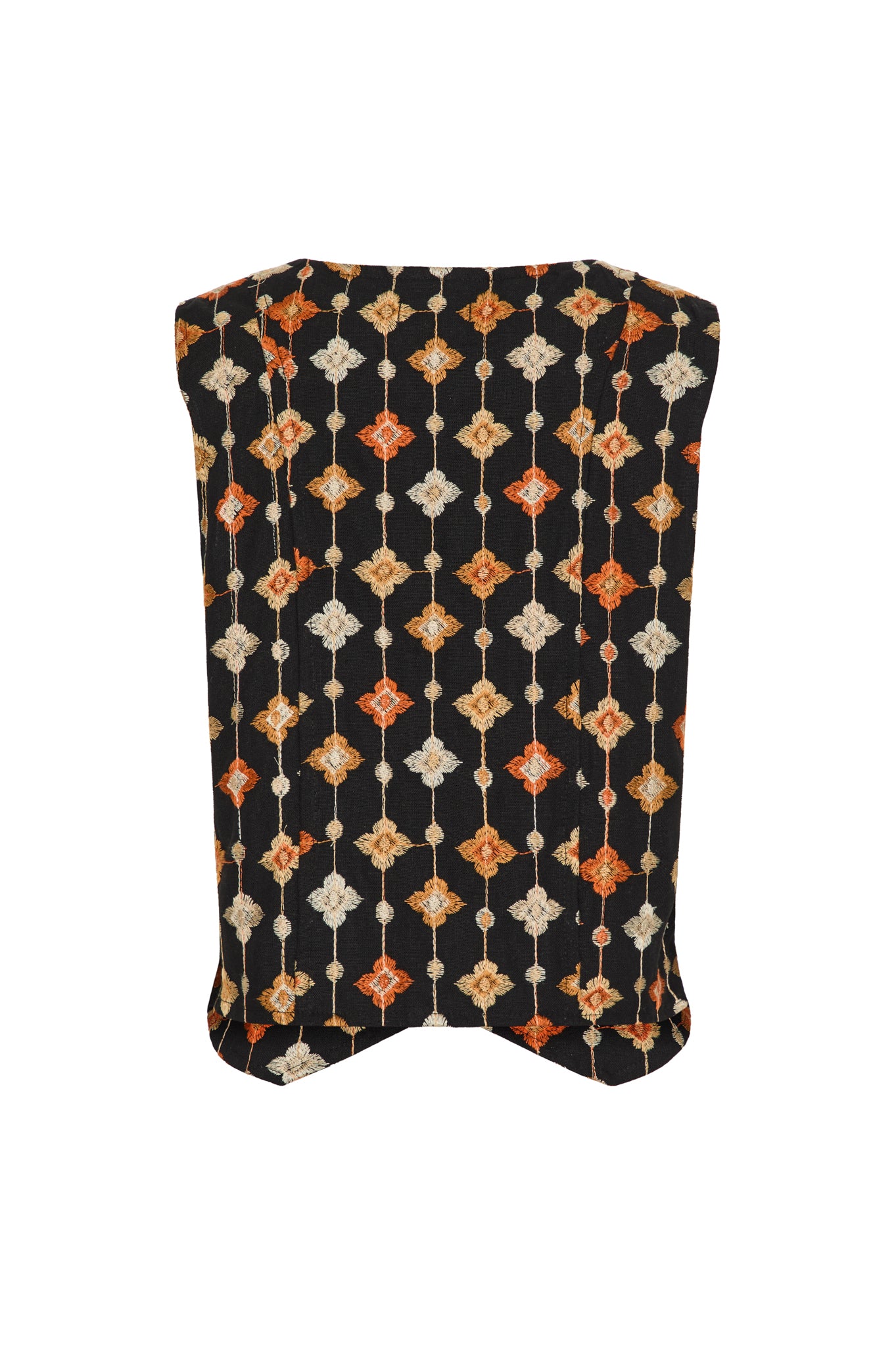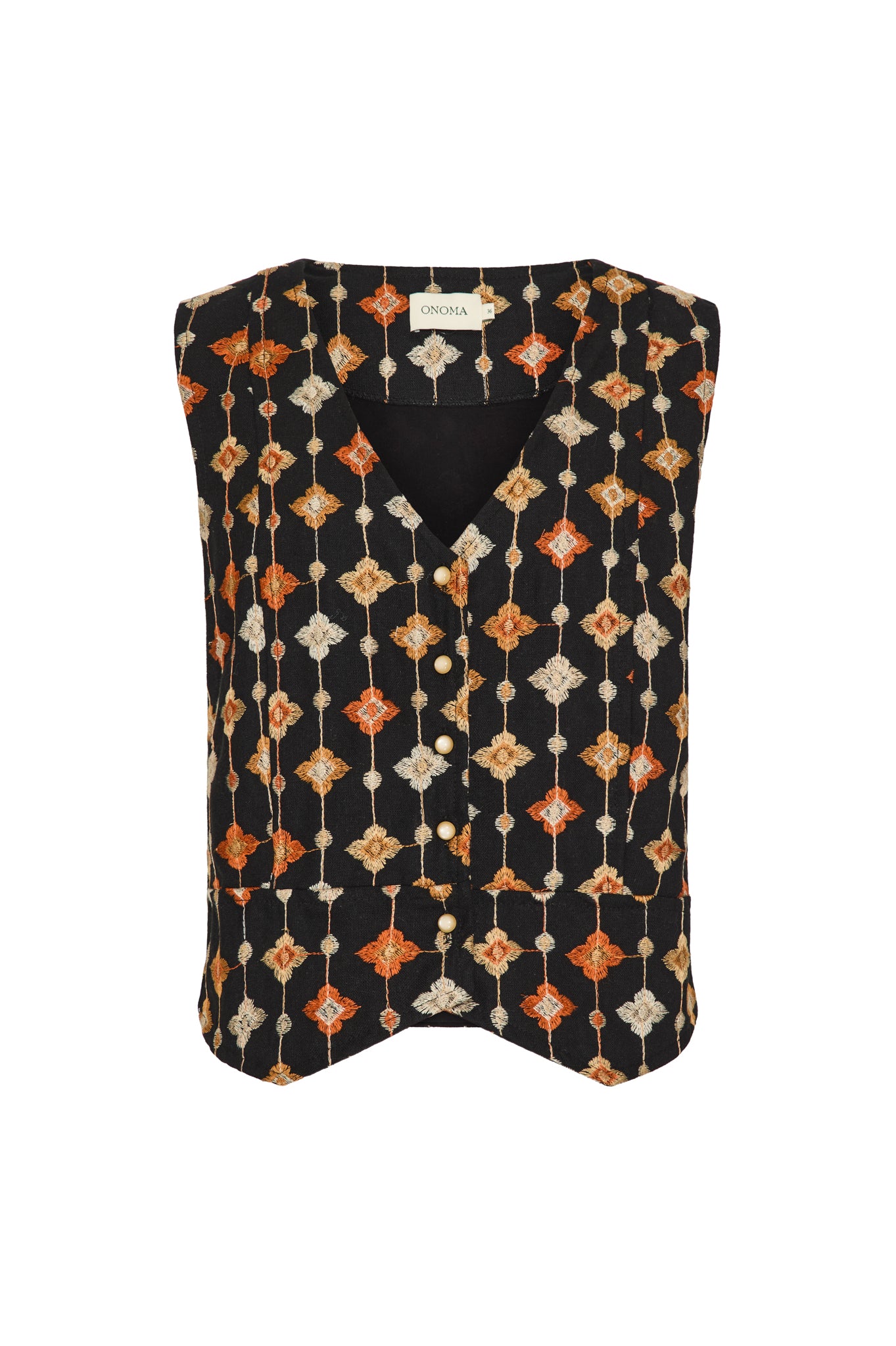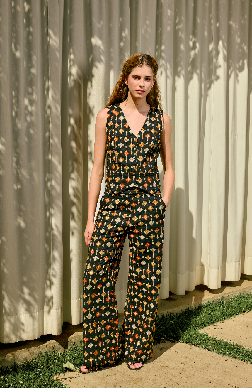 O Colete Ayla é feito de um tecido leve de linho bordado com flores. Ele pode ser usado como peça única, ou como colete aberto, sobrepondo com uma camiseta ou blusa de manga longa por baixo. Use com a calça Ayla para o look completo. Nós garantimos que você estará chique para qualquer ocasião!
