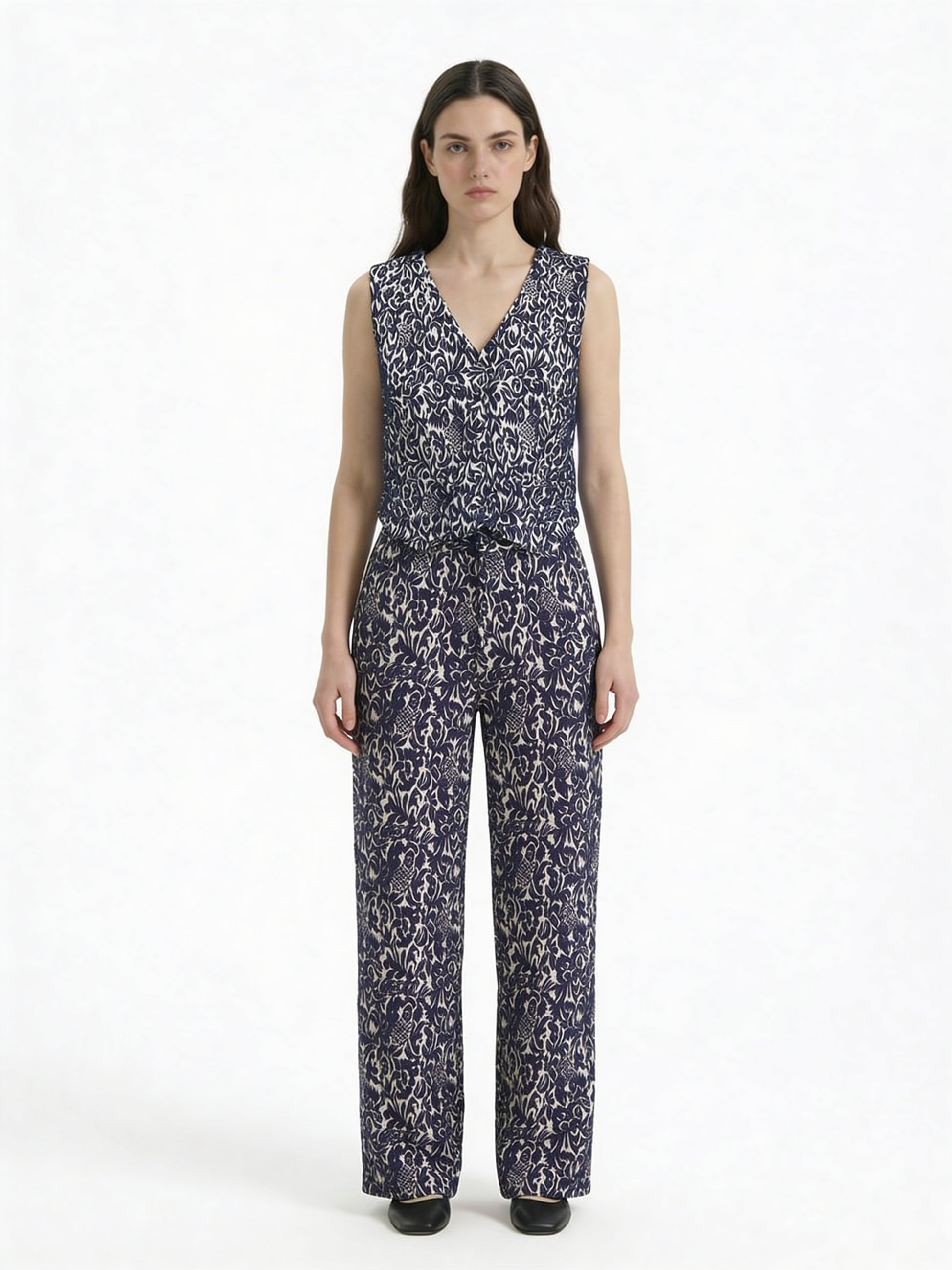 O Colete Livia é feito de um tecido encorpado de jacquard com toque de lã. Ele pode ser usado como peça única, ou como colete aberto, sobrepondo com uma camiseta ou blusa de manga longa por baixo. Use com a calça Livia para o look completo. Nós garantimos que você estará chique para qualquer ocasião!