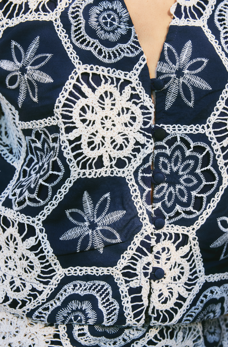 O Conjunto Stella é composto de uma camisa de manga curta e uma saia midi. As peças são feitas de um tecido bordado com crochet. A camisa tem forro na frente e abotoamento forrado no mesmo tecido. A saia tem forro até a metade e fecho de zipper invisível.